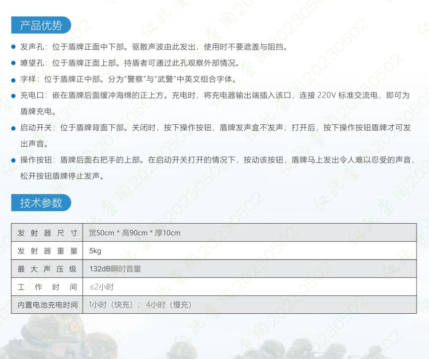 多功能集于一體,結構簡易,便于快速部署,盾牌和發射器二合一,驅散、防身兩不誤,特別適合單兵手持使用。數字功率放大技術,實現高效能量轉換。重量輕,體積小堅固耐用自帶專業電源,可支持不間斷工作二個小時,可由多面聲波盾牌組成聲波陣列,達到最優效果。
