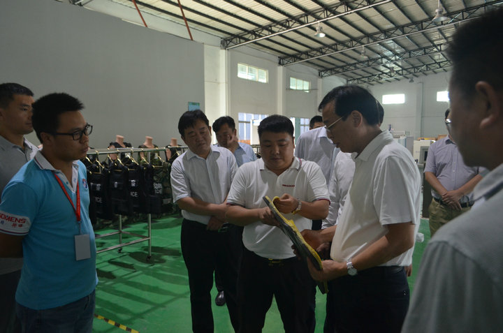 馬正躍書記一行在董事長孟豪、總裁王春麗、執行總裁劉學中的陪同下就我司企業展廳進行了參觀、隨后深入車間查看生產情況,并聽取了孟豪董事長對近年來守門神科技集團的發展及科研成果情況的匯報。